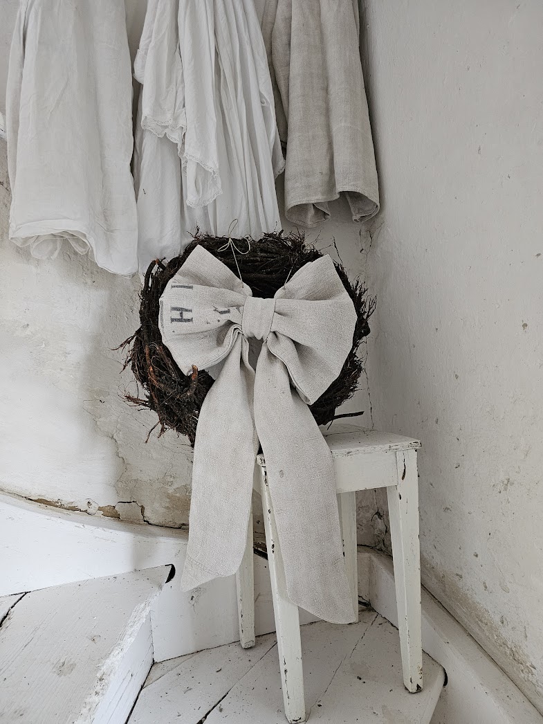 Diese XXXL- Schleife ist aus antikem Getreidesack Leinen entstanden - mit der originalen Beschriftung MH. usw.........