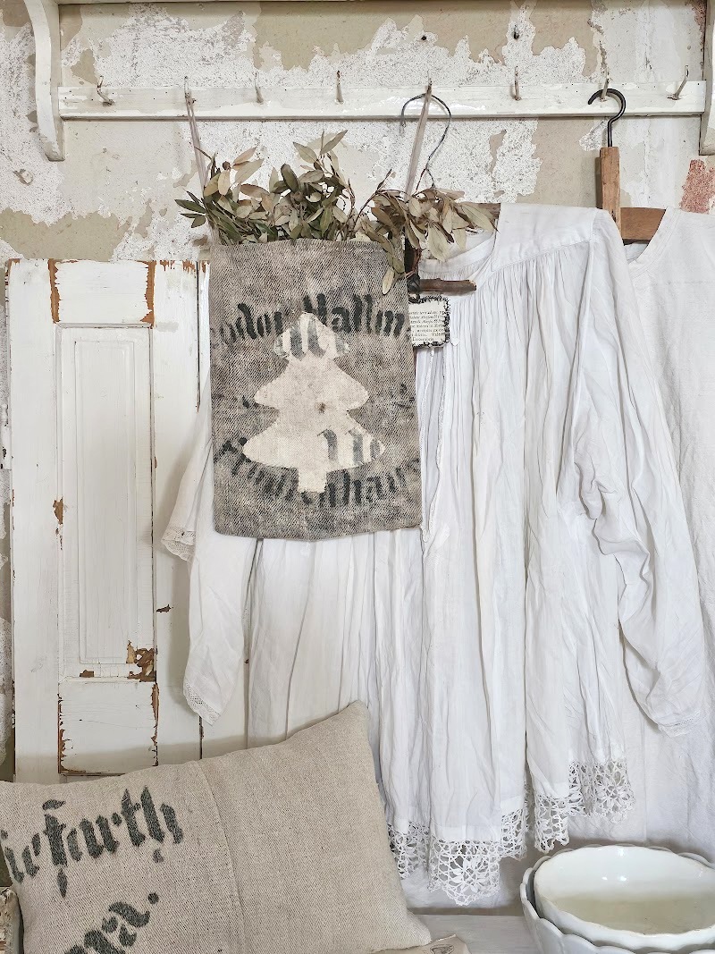 Dazu ist das Kissen mit einem alten Leinenband und einer uralten französischen Plakette verziert (beides abnehmbar). Man könnte auch gut ein Dokument oder andere Jahreszeitliche Dekoration an das Band klemmen!