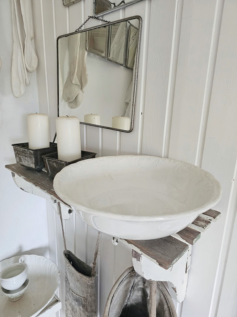 Diese antike sehr große Schüssel aus sahneweißer Keramik hatte wir aus Frankreich mitgebracht.