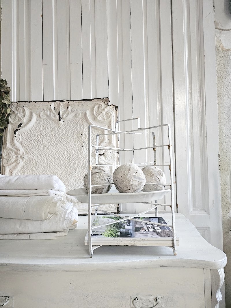 Der Tarteständer (auf dem früher die Tarteböden zum abkühlen eingeschoben wurden) ist aus Metall und hat einen alten weißen Anstrich.