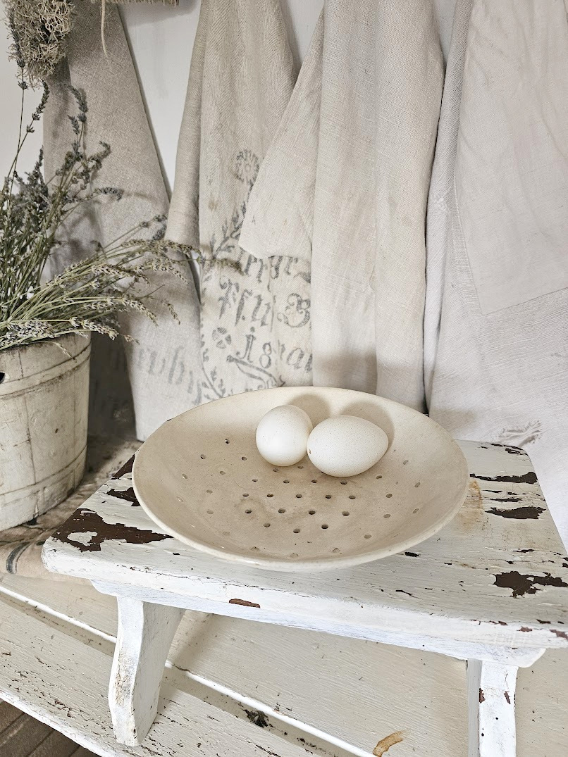 Diese uralte und tiefe Abtropfschale (ähnlich einer flacheren Schüssel) ist aus sahneweiß glasierter Keramik und hat über die Zeit eine schöne Patina durch feine Verfärbungen in der keramik angenommen. Der Boden ist gemarkt PEXONNE FF