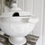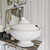 Die Terrine ist aus dicker weißen Keramik gefertigt in der sich feinste Verfärbungen befinden, die aber auch vom hohen Alter der Terrine zeugen - s. Foto.